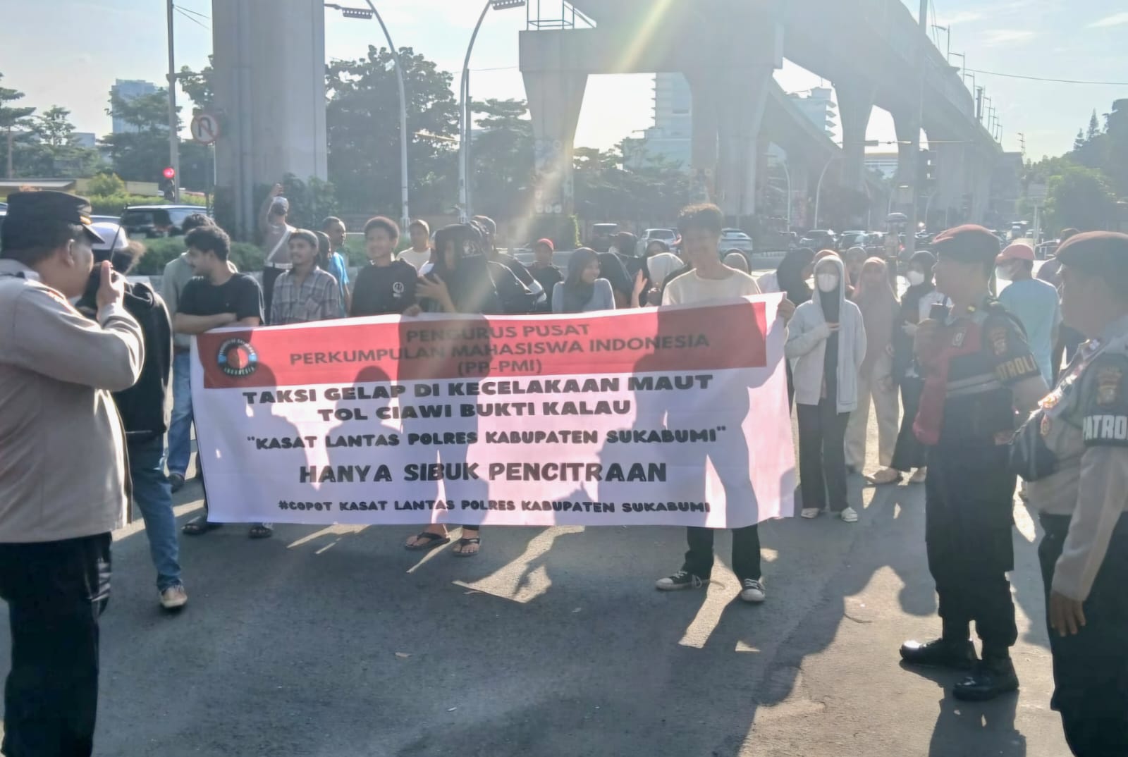 Jakarta 28 Februari 2025, Puluhan Mahasiswa yang tergabung dalam Pengurus Pusat-Perkumpulan Mahasiswa Indonesia ( PP-PMI) menggeruduk Mabes Polri terkait adanya Taksi Gelap dari kabupaten sukabumi dalam kecelakaan maut di Tol Ciawi yang berasal dari kabupaten sukabumi, Pengurus Pusat Perkumpulan Mahasiswa Indonesia (PP-PMI) berpendapat hal ini tidak mestinya terjadi kalau Kasat Lantas Polres Sukabumi kabupaten tidak sibuk Pencitraan.