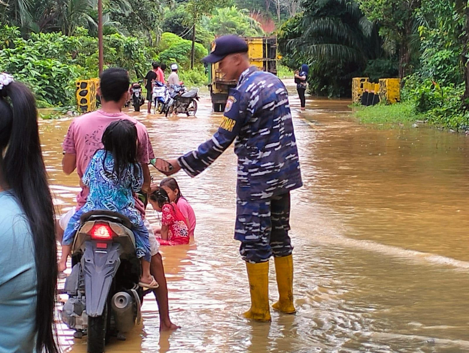 Detikdjakarta TNI AL, Sibolga,- Akibat tingginya curah hujan mengakibatkan meluapnya air sungai, dan drainase tidak dapat menampung debit air sehingga air meluap sampai di pemukiman warga di Kecamatan Natal, Kabupaten Mandailing Natal, Jum’at (22/09/2023).