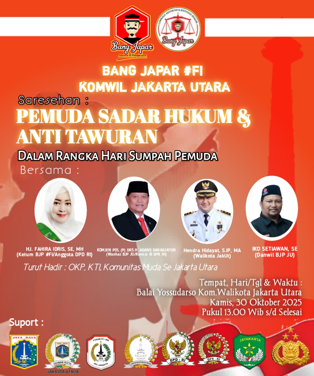 DetikDjakarta.Com.Jakarta Utara, 28 Oktober 2025 – Dalam rangka memperingati Hari Sumpah Pemuda, Ormas Bang Japar (Kebangkitan Jawara dan Pengacara) Komwil Jakarta Utara akan menggelar kegiatan Sarasehan bertajuk “Pemuda Sadar Hukum & Anti Tawuran” yang akan dilaksanakan pada Kamis, 30 Oktober 2025, bertempat di Balai Yos Sudarso, Kantor Walikota Jakarta Utara, mulai pukul 13.00 WIB hingga selesai.