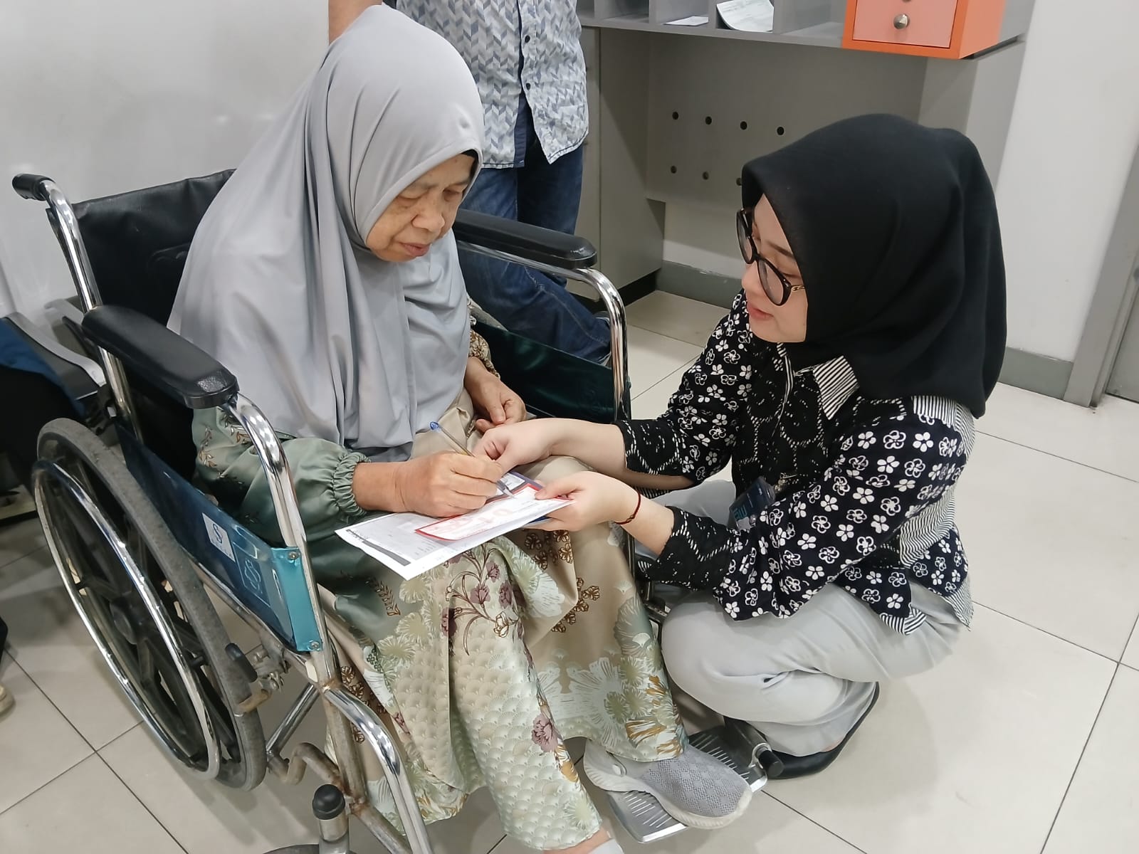 Seorang frontliner dengan sabar dan penuh empati membantu nasabah yang menggunakan kursi roda untuk melakukan transaksi perbankan. Dengan fasilitas yang memadai dan pelayanan yang personal, nasabah merasa nyaman dan dihargai. ‘Terima kasih, BRI Unit Kembangan, pelayanannya sangat baik dan ramah,’ kata nasabah dengan senyum puas.