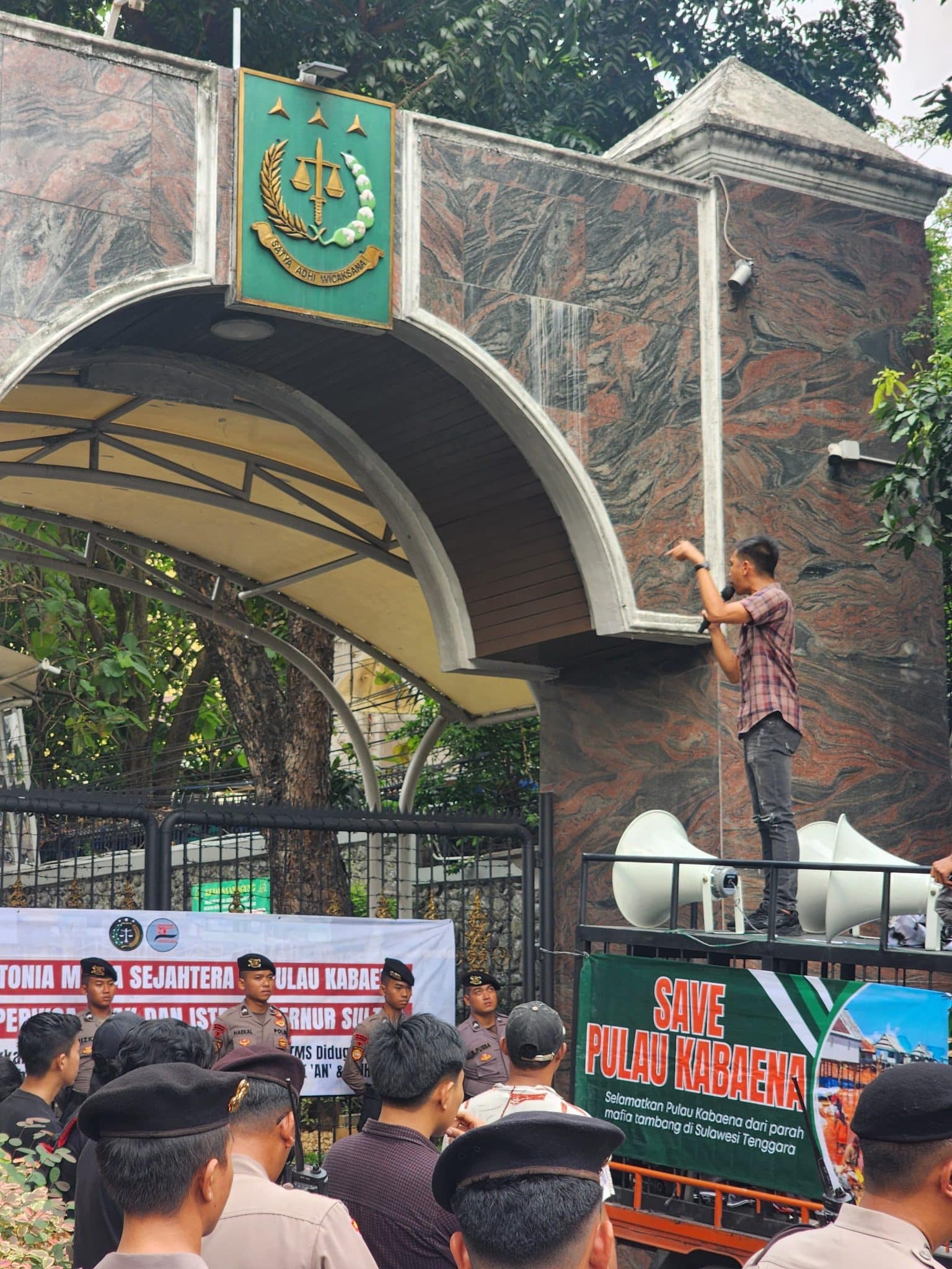 Massa menuntut pengusutan tuntas terhadap aktivitas pertambangan nikel oleh PT Tonia Mitra Sejahtera (TMS) di Pulau Kabaena, Kabupaten Bombana, Sulawesi Tenggara, yang mereka nilai sebagai bentuk perusakan lingkungan berskala masif.