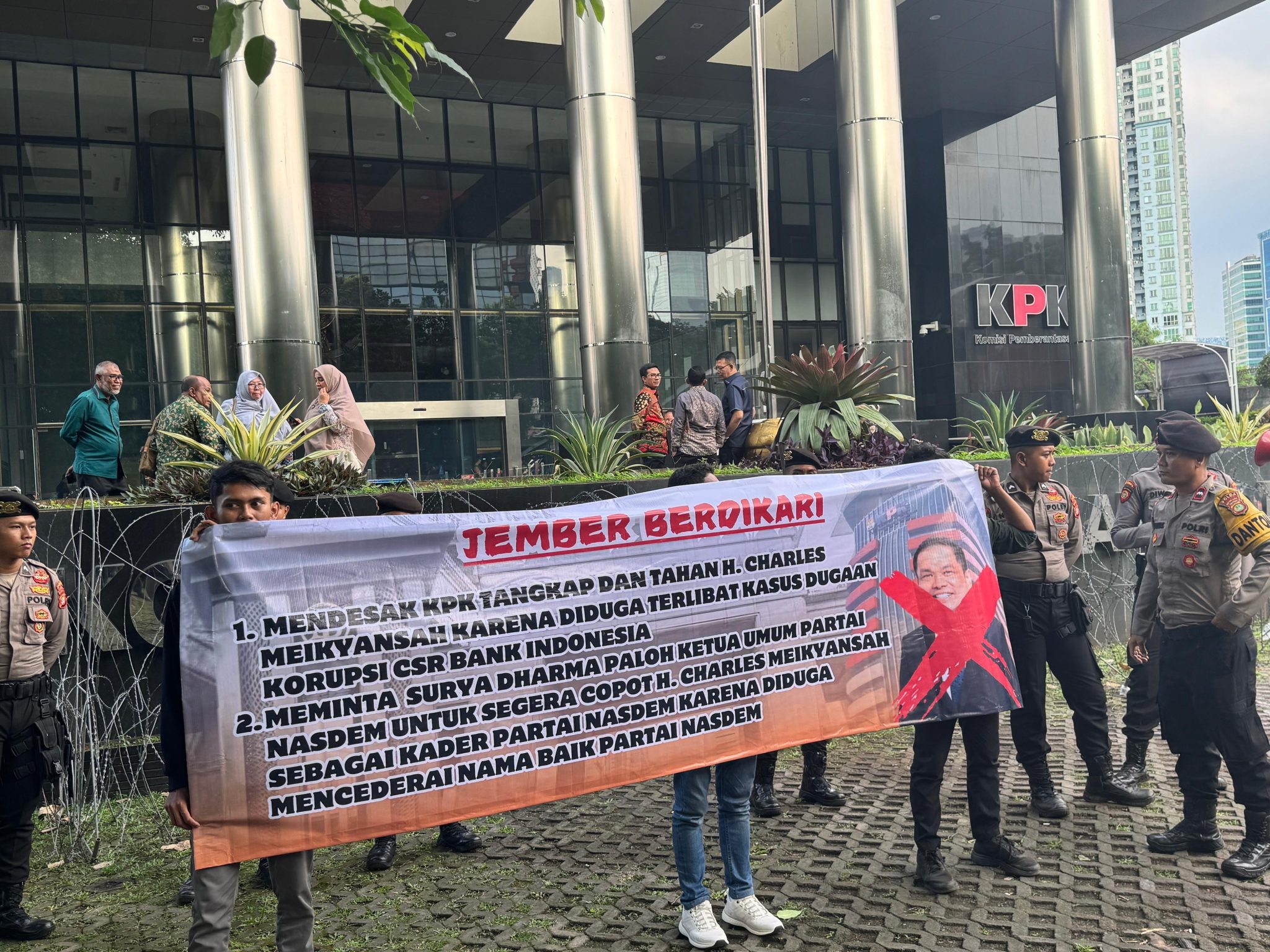 Sejumlah Mahasiswa yang tergabung dalam Jember Berdikari yang ada di Jakarta menggelar aksi demonstrasi di depan Gedung Komisi Pemberantasan Korupsi (KPK), Senin, 05/05/2025, dengan tuntutan utama agar KPK segera panggil & periksa Charles Meikyansyah, anggota DPR RI Komisi XI 2019-2024 dari Fraksi Partai NasDem.