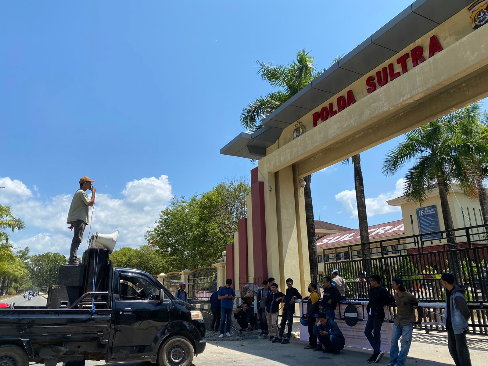 Sejumlah mahasiswa dan aktivis yang tergabung dalam konsorsium mahasiswa bersatu melakukan aksi demontrasi di depan Mapolda Sulawesi Tenggara untuk mempertanyakan kasus pemukulan mahasiswa/aktivis di depan RS Hermina Kendari, yang ditangani oleh PROPAM polda Sulawesi Tenggara