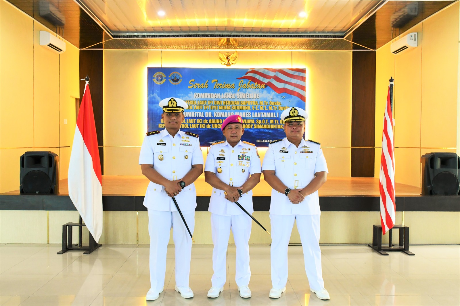 Detikdjakarta.com TNI AL, Simeulue,- Serah Terima Jabatan Komandan Lanal Simeulue diserah terimakan dari Letkol Laut (P) Dwi Herdian Saputra, M.Tr.Opsla., kepada Letkol Laut (P) Oyu Mulia Sukmana S.T., M.T., M.Tr. Opsla., yang dipimpin langsung oleh Komandan Pangkalan Utama TNI AL I Brigjen TNI (MAR) Jasiman Purba, S.E., CHRMP., bertempat di Gedung O.B. Syaa’f Mako Lantamal I Belawan, Sumatra Utara Jum’at (03/05/2024).