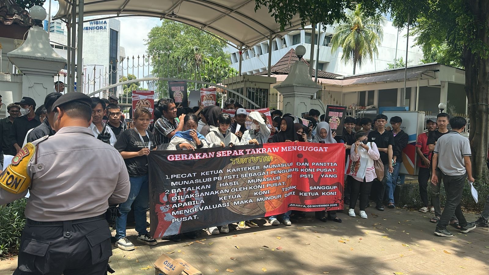 Aksi demonstrasi di depan Kemenpora berlangsung dengan pengawalan ketat aparat kepolisian. Massa menyerukan agar Menpora RI turun tangan langsung menyelamatkan PB PSTI dari krisis legitimasi dan mengembalikan sepak takraw Indonesia ke jalur prestasi dan kehormatan.
