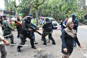 Simulasi demonstrasi diperagakan oleh personel gabungan Lanal Bandung baik Militer maupun Pegawai Negeri Sipil selama 1 jam hingga berakhir setelah bunyi tembakan peringatan dilepaskan dari senjata pasukan Tim PPH.