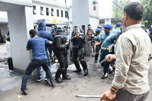 Detikdjakarta-TNI AL, Bandung,- Saling dorong dan sempat rusuh, aksi unjuk rasa warga di depan Markas Komando Pangkalan TNI Angkatan Laut (AL) Bandung berhasil dihalau Tim Pengendali Huru-Hara (PHH) Lanal Bandung, Kamis (07/09/2023).