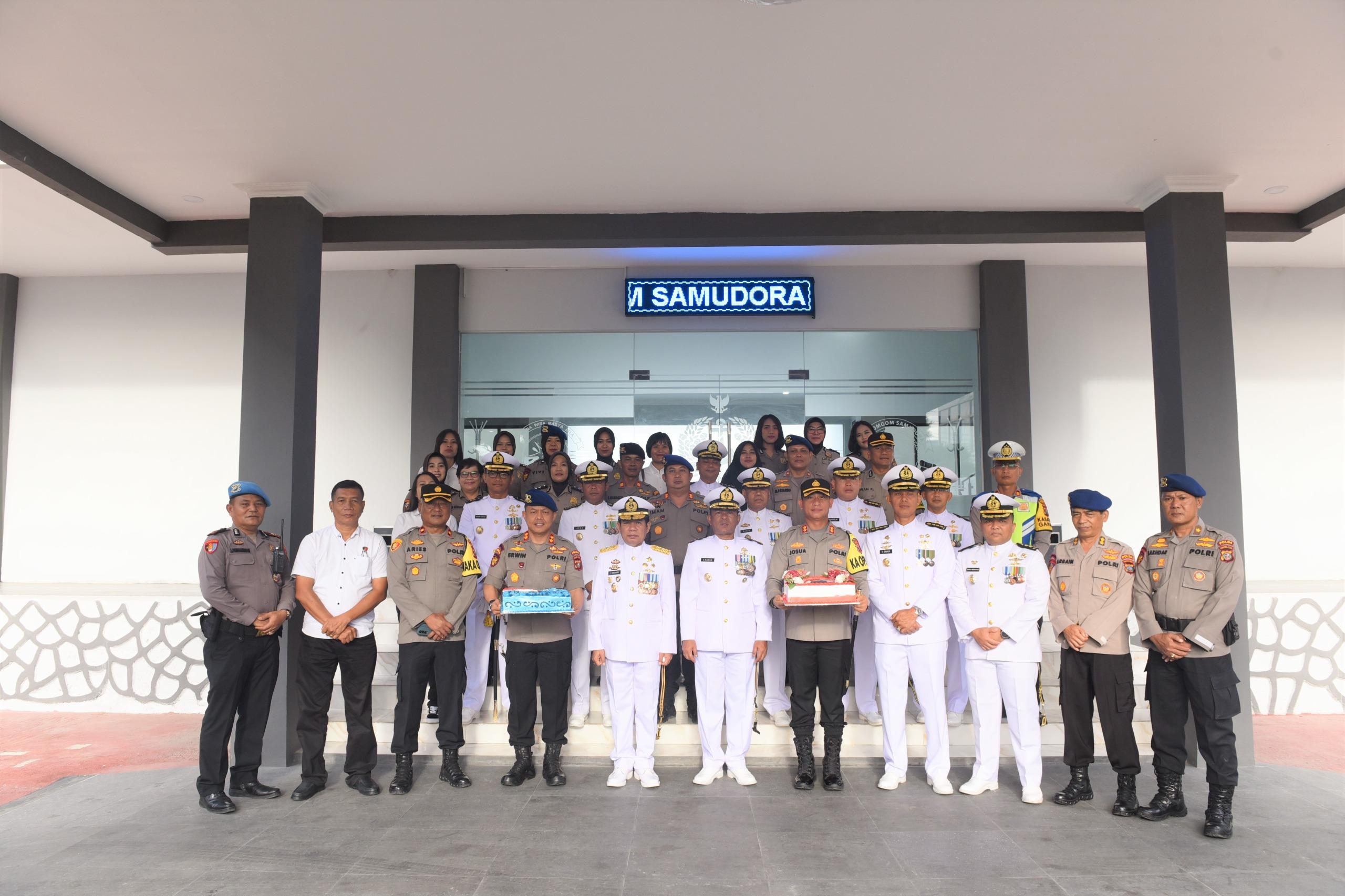 TNI AL, Belawan,- Komandan Pangkalan Utama TNI Angkatan Laut (Danlantamal I) Laksamana Pertama TNI Johanes Djanarko Wibowo diwakili Kaotmilti I Medan Laksamana Pertama TNI Efendi Maruapey menerima surprise dari Kapolres Belawan AKBP Josua Tampubolon dan Dirpolairud Polda Sumatera Utara yang diwakili Wadirpolairud AKBP Erwin Siahaan beserta rombongan, bertempat di Ruang Lobi Mako Lantamal I, Jalan Serma Hanafiah No. 01 Belawan, Sumatera Utara, Senin (11/9/2023).