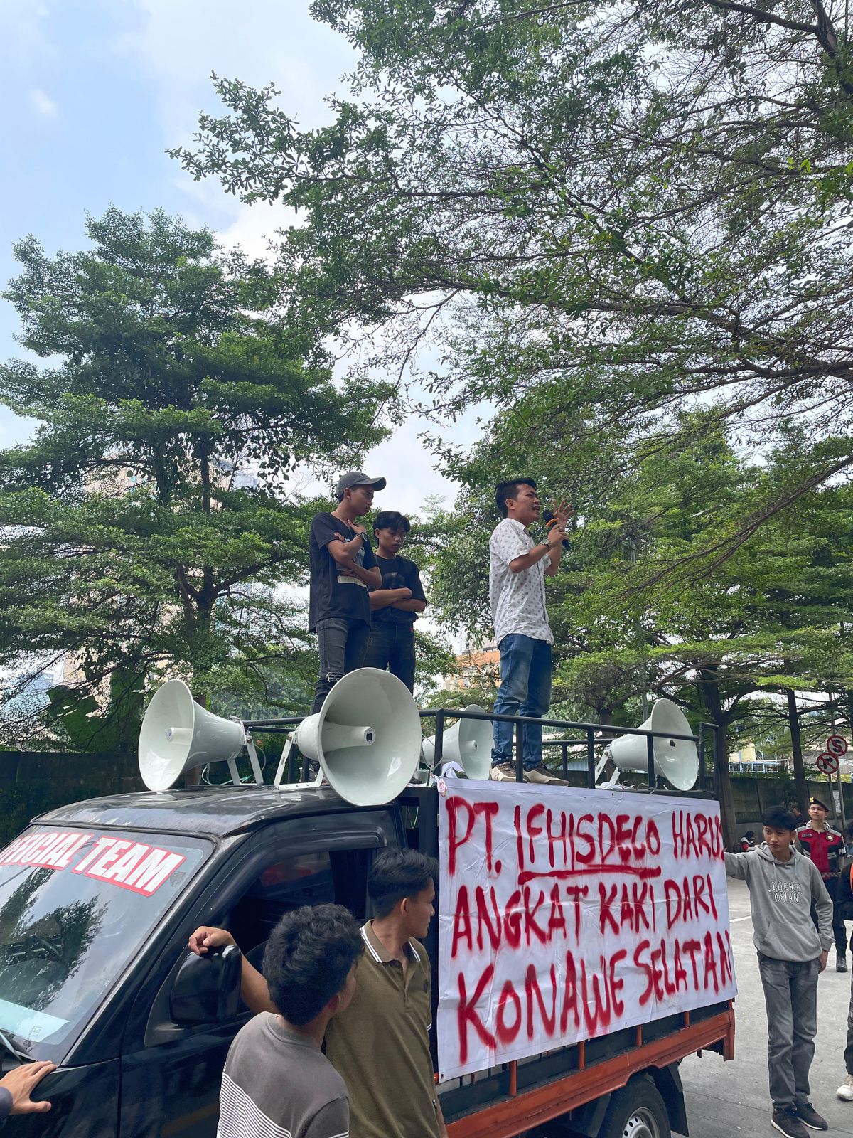 Jakarta, 25 Juli 2025 — Puluhan mahasiswa yang tergabung dalam Himpunan Mahasiswa Islam (HMI) Cabang Konawe Selatan (Konsel) menggelar aksi demonstrasi di depan kantor pusat PT Ifhisdeco Tbk di kawasan Grand Sahid Sudirman, Jakarta.