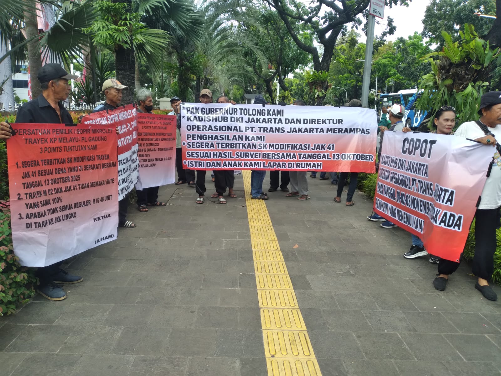 11 November 2025 — Puluhan anggota Persatuan Pemilik dan Sopir Mikrolet M02 rute Kampung Melayu – Terminal Pulogadung menggelar aksi protes di halaman Balai Kota DKI Jakarta pada hari Selasa (11/11). Aksi ini merupakan puncak kekecewaan para sopir yang merasa penghasilan mereka dimatikan akibat rute Mikrolet M02 yang persis sama dengan rute TransJakarta Koridor 41 selama lima tahun terakhir.