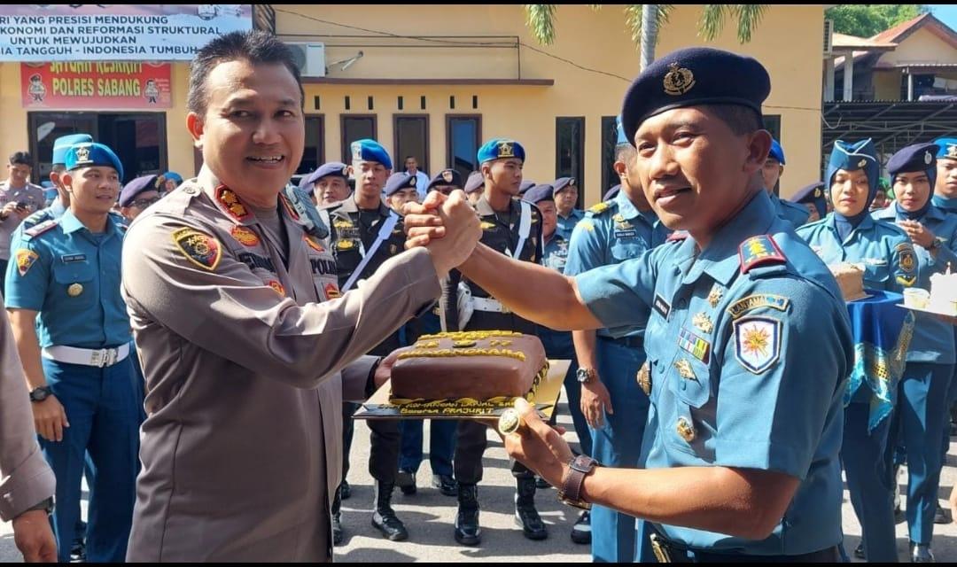 Detikdjakarta-TNI AL, Sabang,- Pangkalan TNI Angkatan Laut (Lanal) Sabang dipimpin oleh Danlanal Sabang Letkol Laut (P) Son Haji Hariyoko, M.Tr. Hanla., M.M., sambangi Polres Sabang memberikan surprise dan Ucapan HUT Bhayangkara Ke-77 Tahun 2023, bertempat di Mako Polres Sabang, Jalan Perdagangan, Gampong Kuta Barat, Kecamatan Sukakarya, Kota Sabang, Senin (3/7/2023).